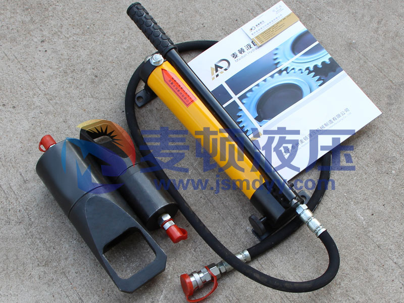 3、壓動手動油泵,使劈刀頂出推進至螺母,當劈刀頂進螺母二分之一時,須小心的壓動手泵,以免用力過猛,劈刀快速將螺母劈開損傷螺栓絲扣。